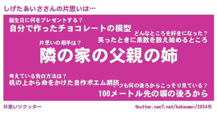 | 胡散臭い通販商品みたいなあだ名 | 『必ず成功するブレスレット…その名も「しげたあいさ」』 |