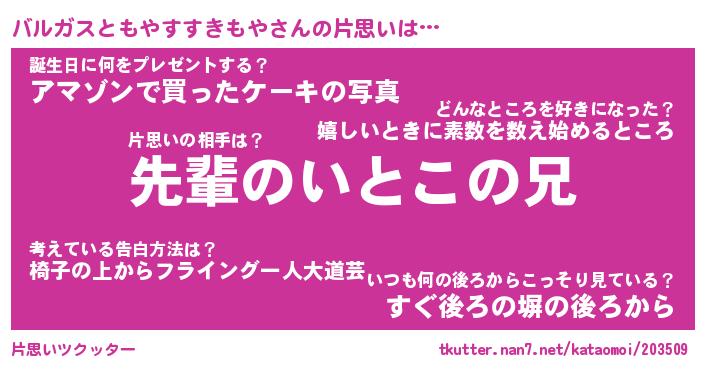 | 男性向けラノベタイトル風あだ名 | 『バルガスともやすすきもやの憂鬱』 |