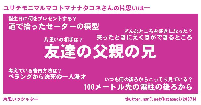 | 番長 | ユサテモニマルマコトマナナタコネ、またの名を・・・!『夕焼けユサテモニマルマコトマナナタコネっち』 |