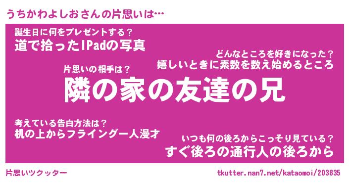 | 男性向けラノベタイトル風あだ名 | 『うちかわよしおの憂鬱』 |