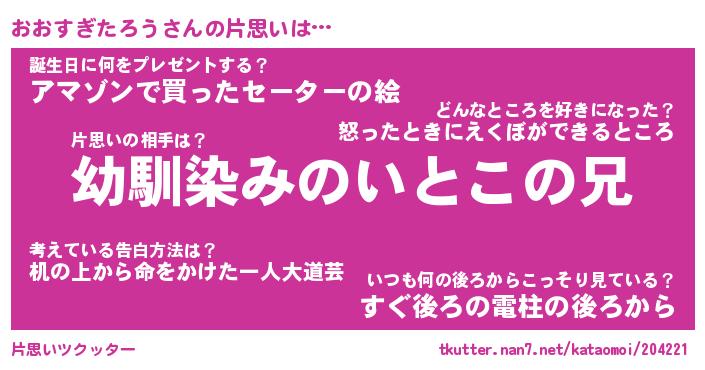 | 男性向けラノベタイトル風あだ名 | 『おおすぎたろうの憂鬱』 |