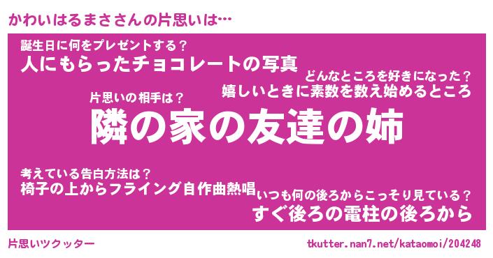| 女子向けラノベタイトル風あだ名 | 『(仮)かわいはるまさのやんごとなき事情』 |