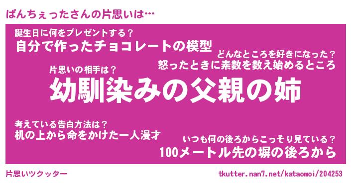 | 男性向けラノベタイトル風あだ名 | 『ぱんちぇったの憂鬱』 |
