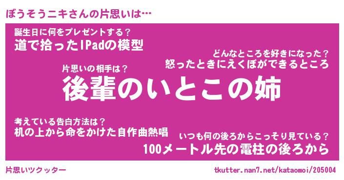 女子向けラノベタイトル風あだ名 | 『誰かこのぼうそうニキを説明してください! ~契約から始まるウェディング~』 |