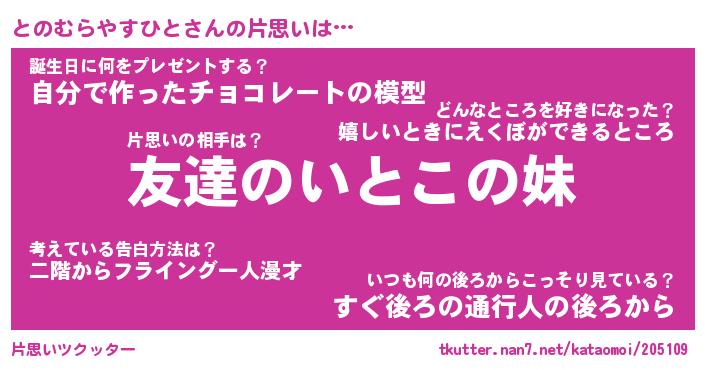 | ヘコむあだ名 | 『とのにゅー』『牛乳』『とのっぺ』 |