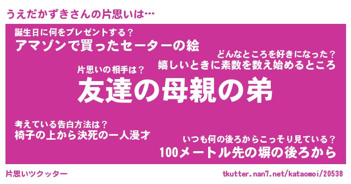 | 女子向けラノベタイトル風あだ名 | 『誰かこのうえだかずきを説明してください! ~契約から始まるウェディング~』 |