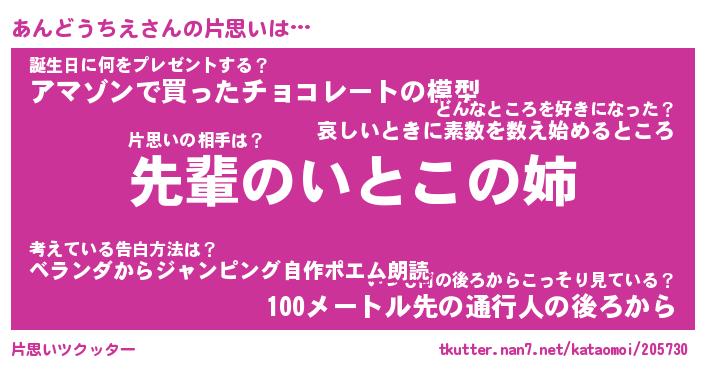 | 男性向けラノベタイトル風あだ名 | 『あんどうちえの憂鬱』 |