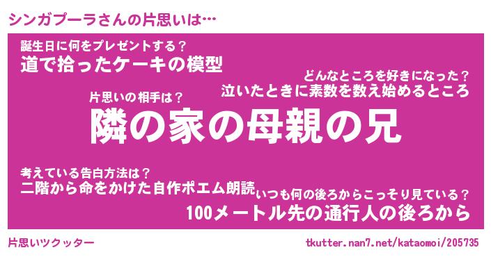 | 男性向けラノベタイトル風あだ名 | 『シンガプーラの憂鬱』 |