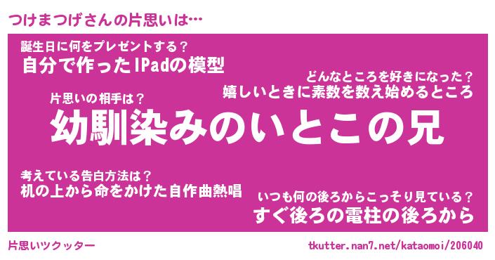 | ポケモン風あだ名 | 『ツケチュウ』『ツケマダネ』 |