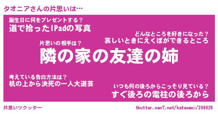 | 男性向けラノベタイトル風あだ名 | 『タオニアの憂鬱』 |