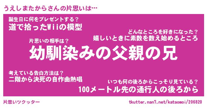 男性向けラノベタイトル風あだ名 | 『うえしまたからの憂鬱』 |