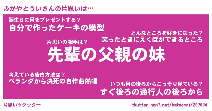 | ヘコむあだ名 | 『ふかふぇ~』『牛乳』『ふかぷりん』 |