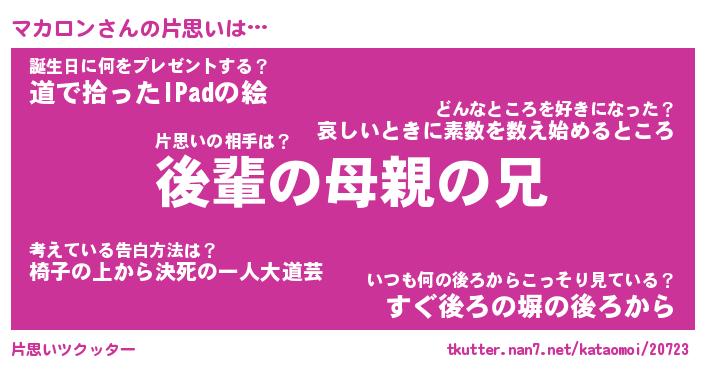 | ピコ太郎風あだ名 | 『マコ次郎』『ピマ六郎』『マカ史郎』 |