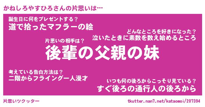 女子向けラノベタイトル風あだ名 | 『誰かこのかねしろやすひろを説明してください! ~契約から始まるウェディング~』 |