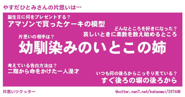 | 女子向けラノベタイトル風あだ名 | 『(仮)やすだひとみのやんごとなき事情』 |