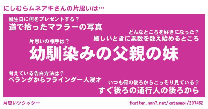 | 男性向けラノベタイトル風あだ名 | 『にしむらムネアキの憂鬱』 |