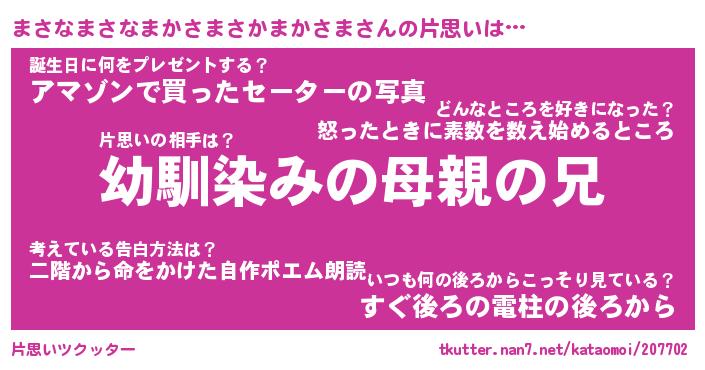 | 女子向けラノベタイトル風あだ名 | 『(仮)まさなまさなまかさまさかまかさまのやんごとなき事情』 |