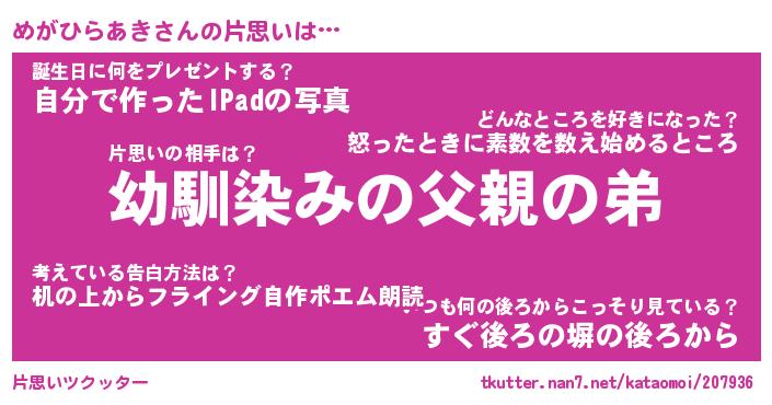 | 恥ずかしいあだ名 | 『プリティーめがひらあき』『めがっちょ』 |