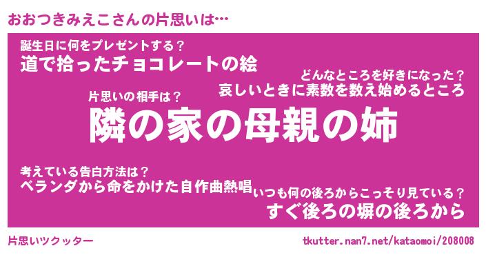 | 女子向けラノベタイトル風あだ名 | 『(仮)おおつきみえこのやんごとなき事情』 |