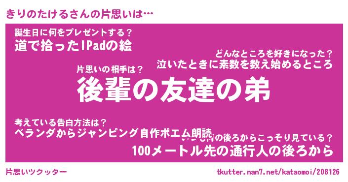 | 恥ずかしいあだ名 | 『プリティーきりのたける』『きりっちょ』 |
