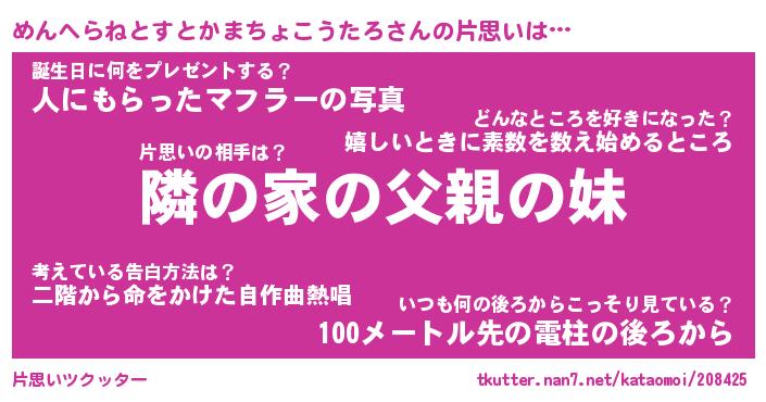 | 胡散臭い通販商品みたいなあだ名 | 『必ず成功するブレスレット…その名も「めんへらねとすとかまちょこうたろ」』 |