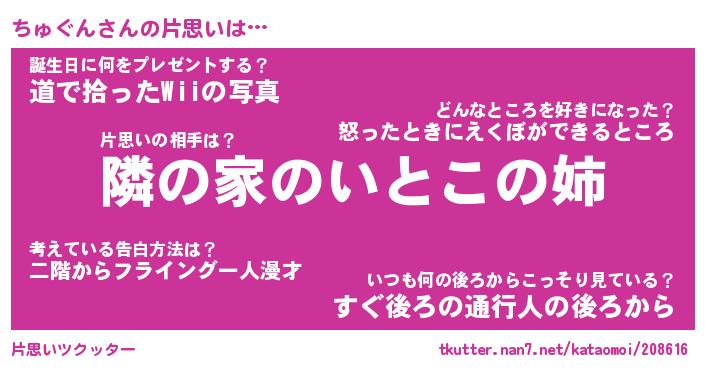 | ヘコむあだ名 | 『ちゅもー』『牛乳』『ちゅぷりん』 |