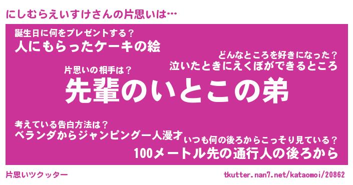 | 男性向けラノベタイトル風あだ名 | 『にしむらえいすけの憂鬱』 |