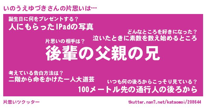 | 胡散臭い通販商品みたいなあだ名 | 『億万長者になれるブレスレット…その名も「いのうえゆづき」』 |