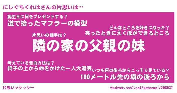 | 女子向けラノベタイトル風あだ名 | 『(仮)にしぐちくれはのやんごとなき事情』 |