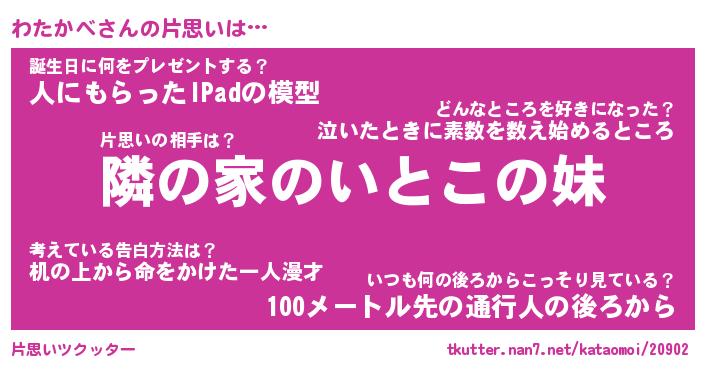 | 女子向けラノベタイトル風あだ名 | 『(仮)わたかべのやんごとなき事情』 |