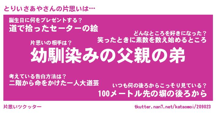 | 女子向けラノベタイトル風あだ名 | 『(仮)とりいさあやのやんごとなき事情』 |