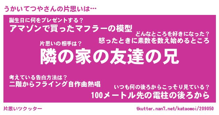 | 男性向けラノベタイトル風あだ名 | 『うかいてつやの憂鬱』 |