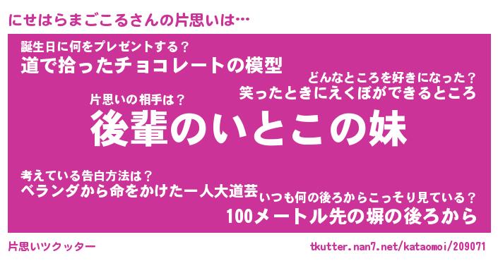 | ヘコむあだ名 | 『にせもー』『豆乳』『にせぷりん』 |