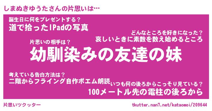| 男性向けラノベタイトル風あだ名 | 『しまぬきゆうたの憂鬱』 |