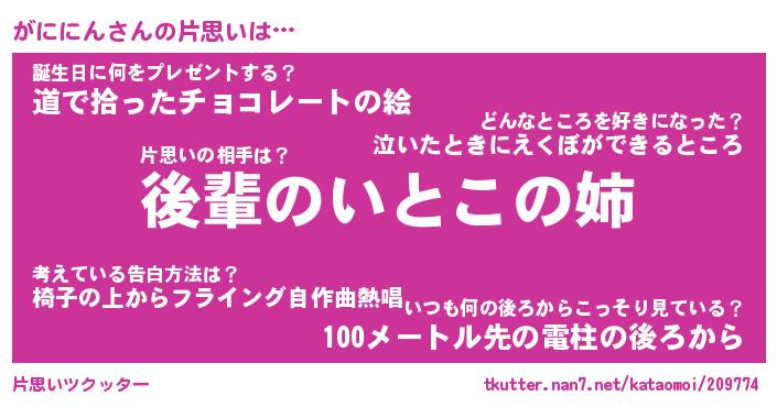 | 意味不明あだ名 | 『ペロリンがににん』『永久保存がににん』 |