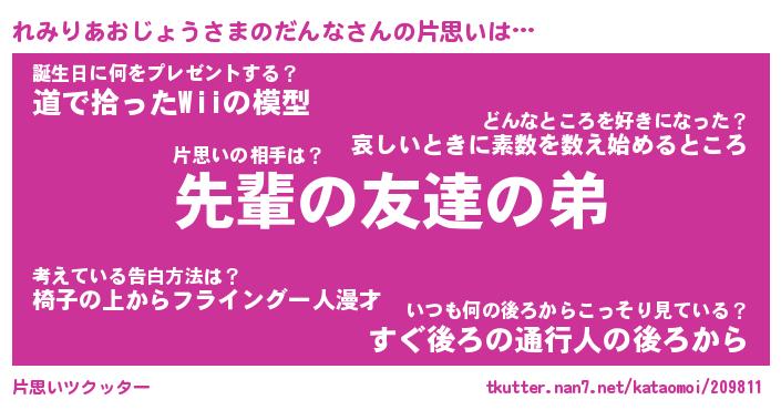 | ツイッター | れみりあおじょうさまのだんなさんのツイッターID『masyumaro_nyan』 |