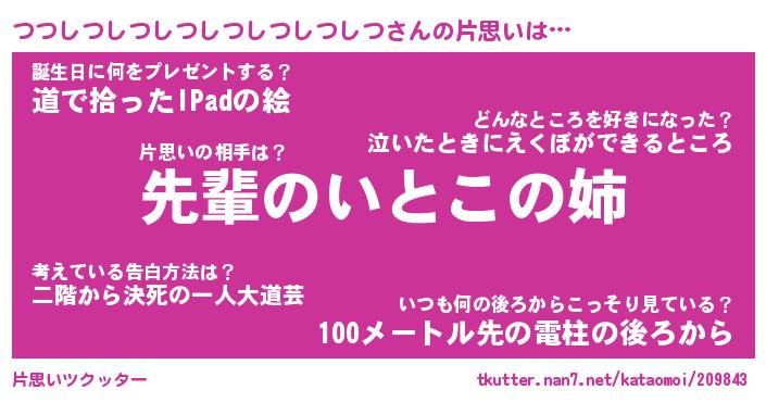 | 男性向けラノベタイトル風あだ名 | 『つつしつしつしつしつしつしつしつの憂鬱』 |
