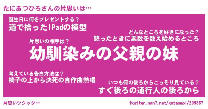 | 女子向けラノベタイトル風あだ名 | 『(仮)たにあつひろのやんごとなき事情』 |