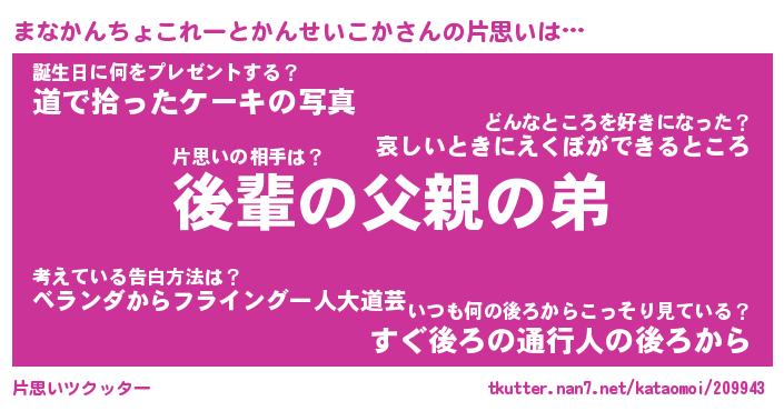 | 胡散臭い通販商品みたいなあだ名 | 『億万長者になれる水晶球…その名も「まなかんちょこれーとかんせいこか」』 |