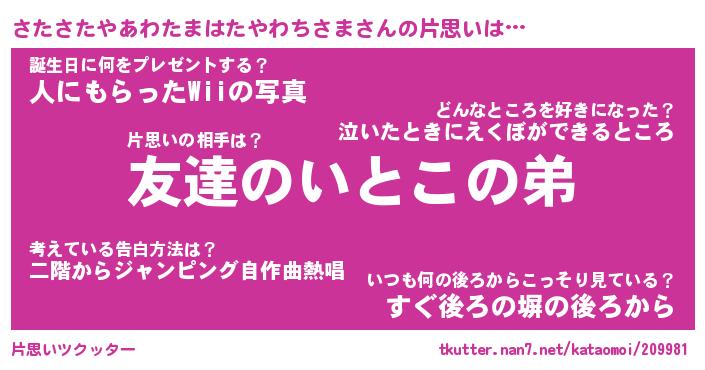 | ツイッター | さたさたやあわたまはたやわちさまさんのツイッターID『fukuyoka_idle』 |