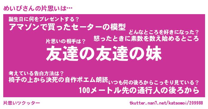 | ヘコむあだ名 | 『めいっふぃ~』『なまこ酢』 |