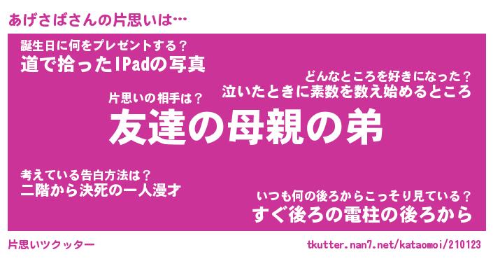 | ファンタジー風あだ名 | 『アゲフェル』『エターナルアゲサバー』 |