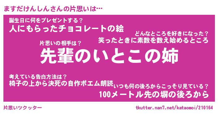 | 男性向けラノベタイトル風あだ名 | 『ますだけんしんの憂鬱』 |