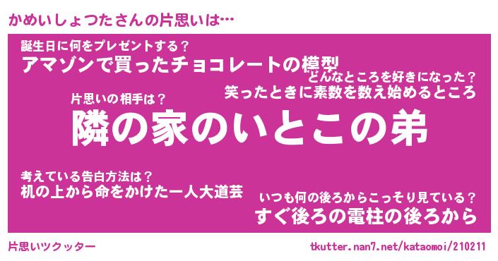 | 男性向けラノベタイトル風あだ名 | 『かめいしょつたの憂鬱』 |