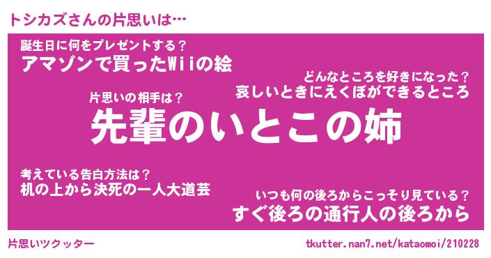 | 男性向けラノベタイトル風あだ名 | 『トシカズの憂鬱』 |
