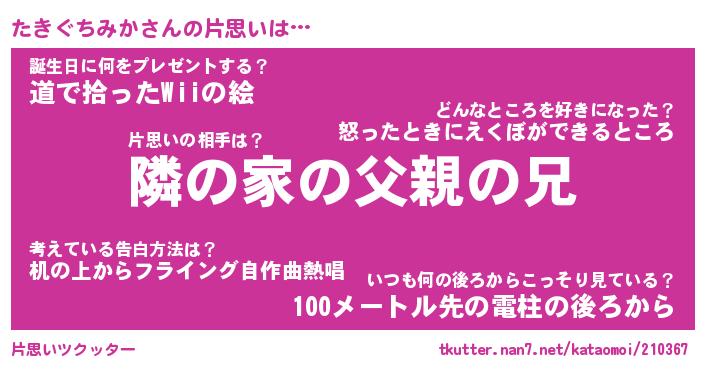 | 胡散臭い通販商品みたいなあだ名 | 『必ず成功する水晶球…その名も「たきぐちみか」』 |