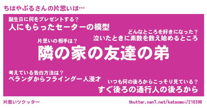 | 胡散臭い通販商品みたいなあだ名 | 『モテモテ間違いなし霊験あらたかなお札…その名も「ちはやぶる」』 |
