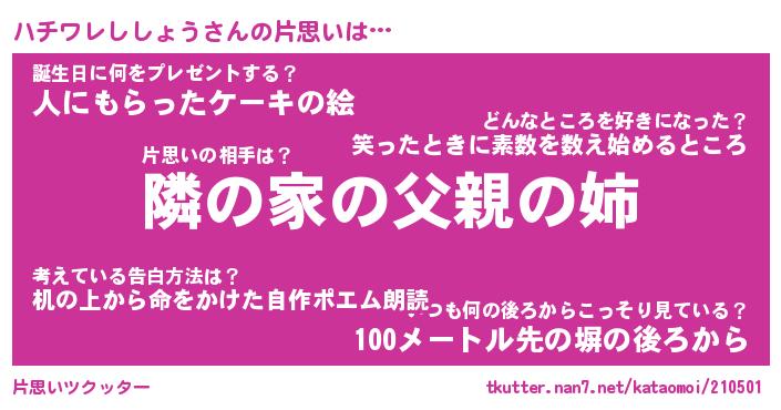 | 男性向けラノベタイトル風あだ名 | 『ハチワレししょうの憂鬱』 |