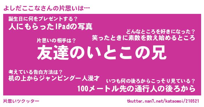 | 胡散臭い通販商品みたいなあだ名 | 『億万長者になれる水晶球…その名も「よしだここな」』 |