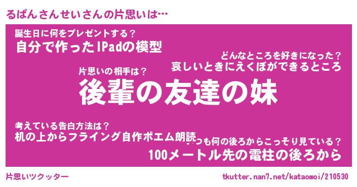 | ヘコむあだ名 | 『るぱっふぃ~』『牛乳』『るぱを』 |